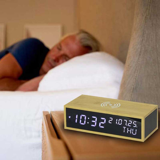 שעון שולחני עץ עם רמקול ומטען אלחוטי