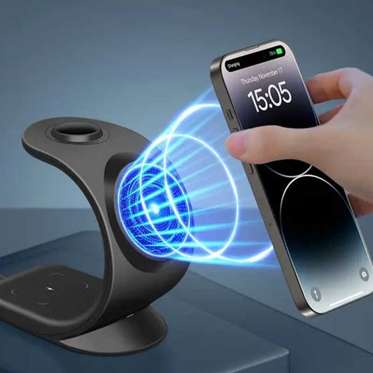 עמדת טעינה אלחוטית משולבת עם רמקול BT, מנורת לילה ושעון שחור